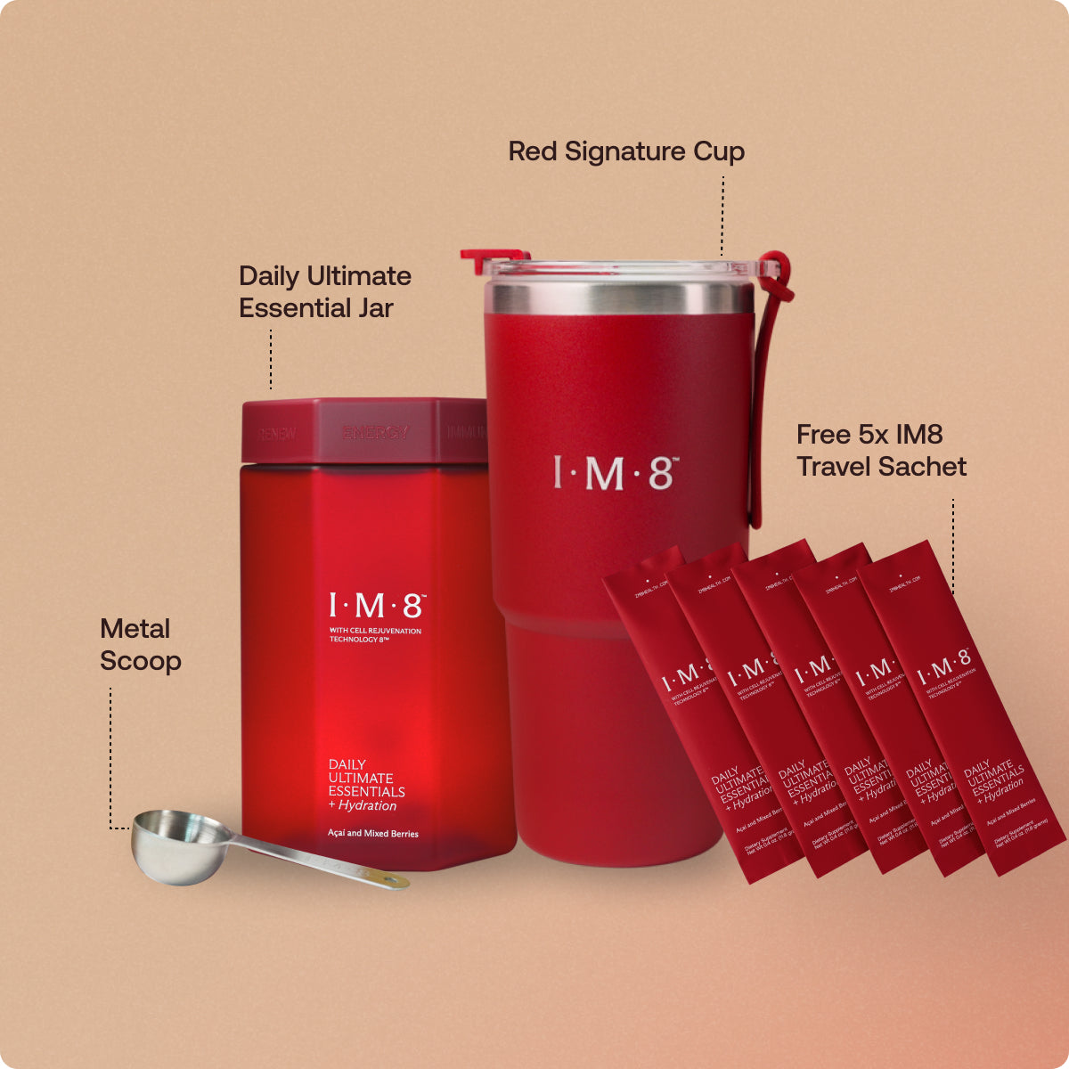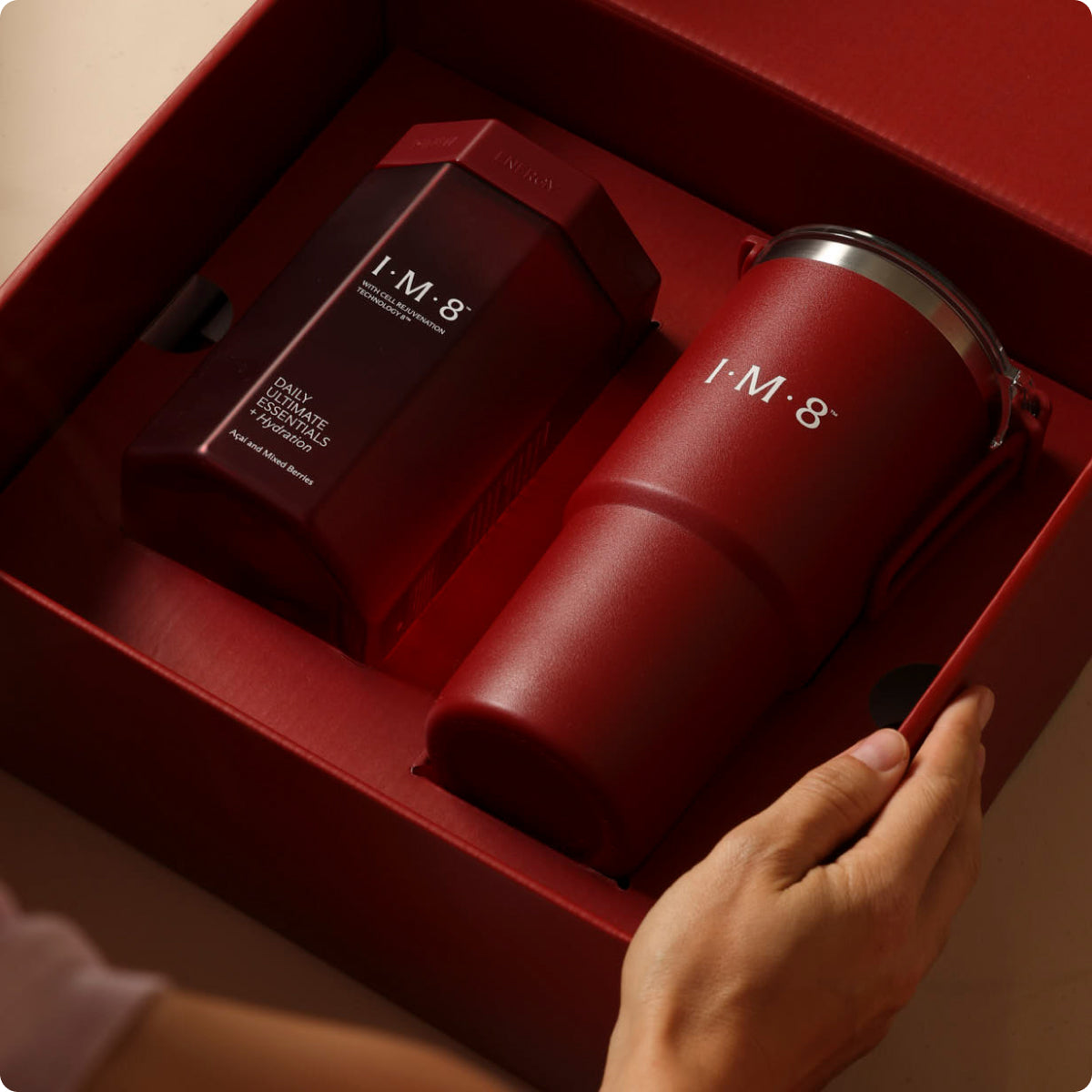 Start your journey with IM8 in style—subscribe to receive an exclusive welcome kit, which includes our signature red cup (a $28 value) and 5 free single-serve sachets (an $18 value) at no extra cost. Plus, save up to 25% with your subscription for added convenience and value. Embrace health with IM8 and enjoy these perks to support your journey.