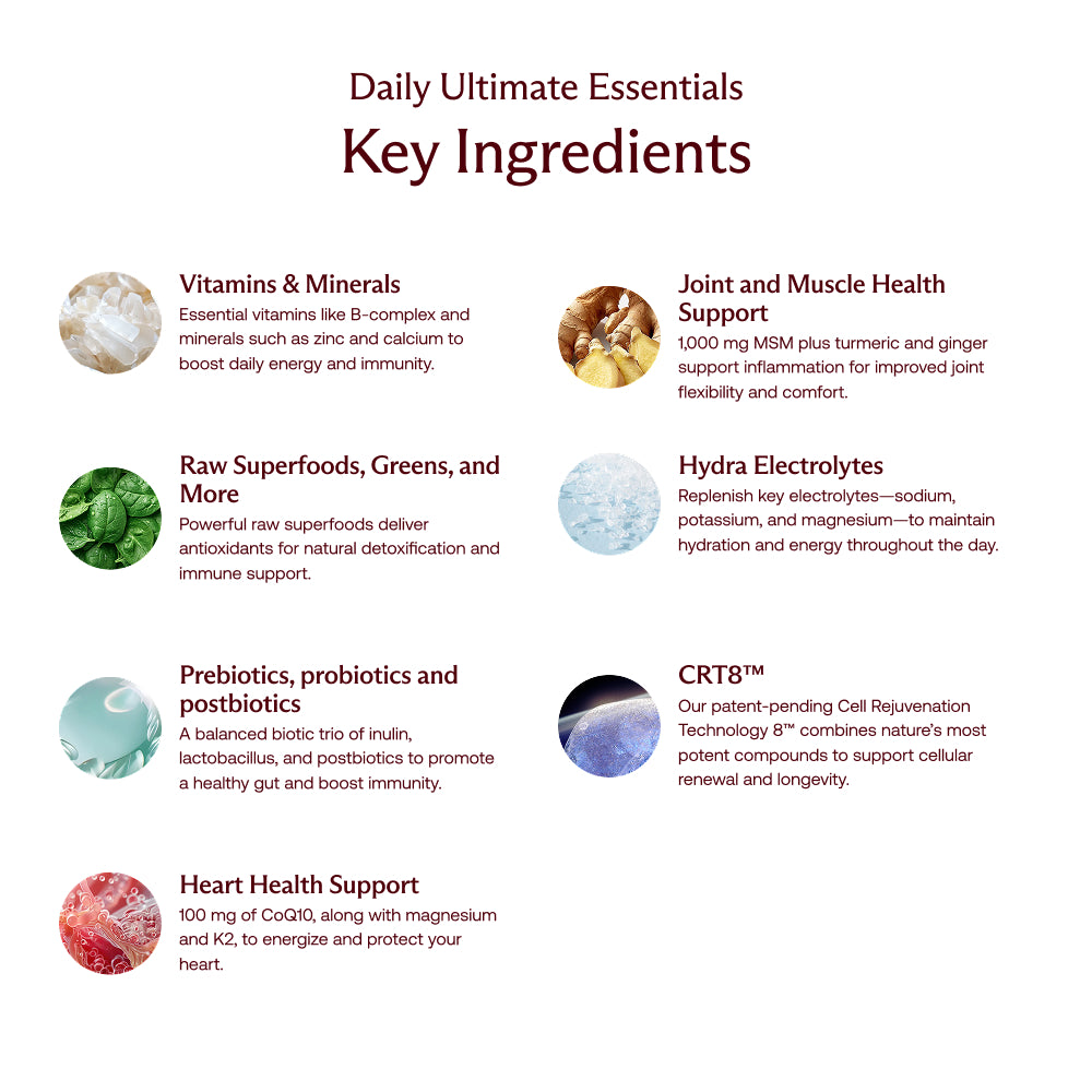 Daily Ultimate Essentials + Hydration: Our comprehensive formula combines 92 nutrient-rich ingredients to fuel your body with everything it needs foroptimal health. Packed with essential vitamins, minerals, antioxidants,superfoods, greens, pre-pro-post-biotics and clinical dosages of CoQ10 andMSM.*