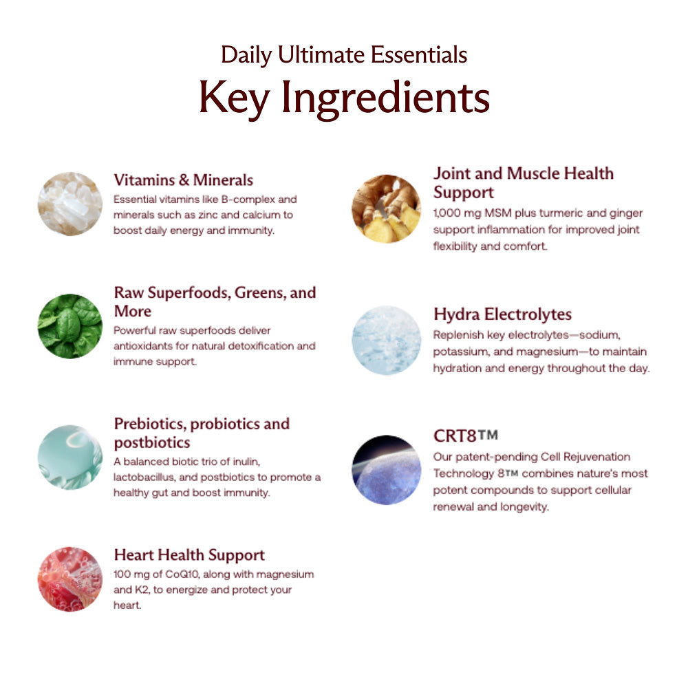 Daily Ultimate Essentials + Hydration: Our comprehensive formula combines 92 nutrient-rich ingredients to fuel your body with everything it needs foroptimal health. Packed with essential vitamins, minerals, antioxidants,superfoods, greens, pre-pro-post-biotics and clinical dosages of CoQ10 andMSM.*