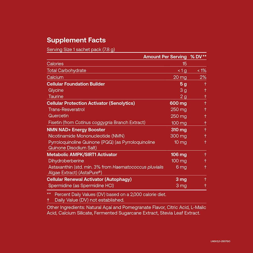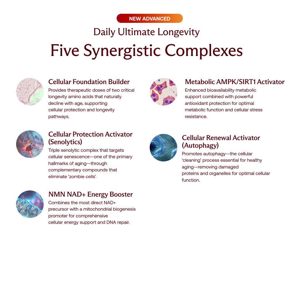 Daily Ultimate Longevity + Healthy Aging: Designed for cellular longevity, this advanced formula targets all 12 hallmarks of aging with five synergistic complexes. Our NMN NAD+ Energy Booster, Cellular Foundation Builder, Cellular Protection Activator, Metabolic AMPK/SIRT1 Activator, and Cellular Renewal Activator work together to enhance mitochondrial function, promote autophagy, and deliver comprehensive age-defying benefits in one delicious daily drink.*