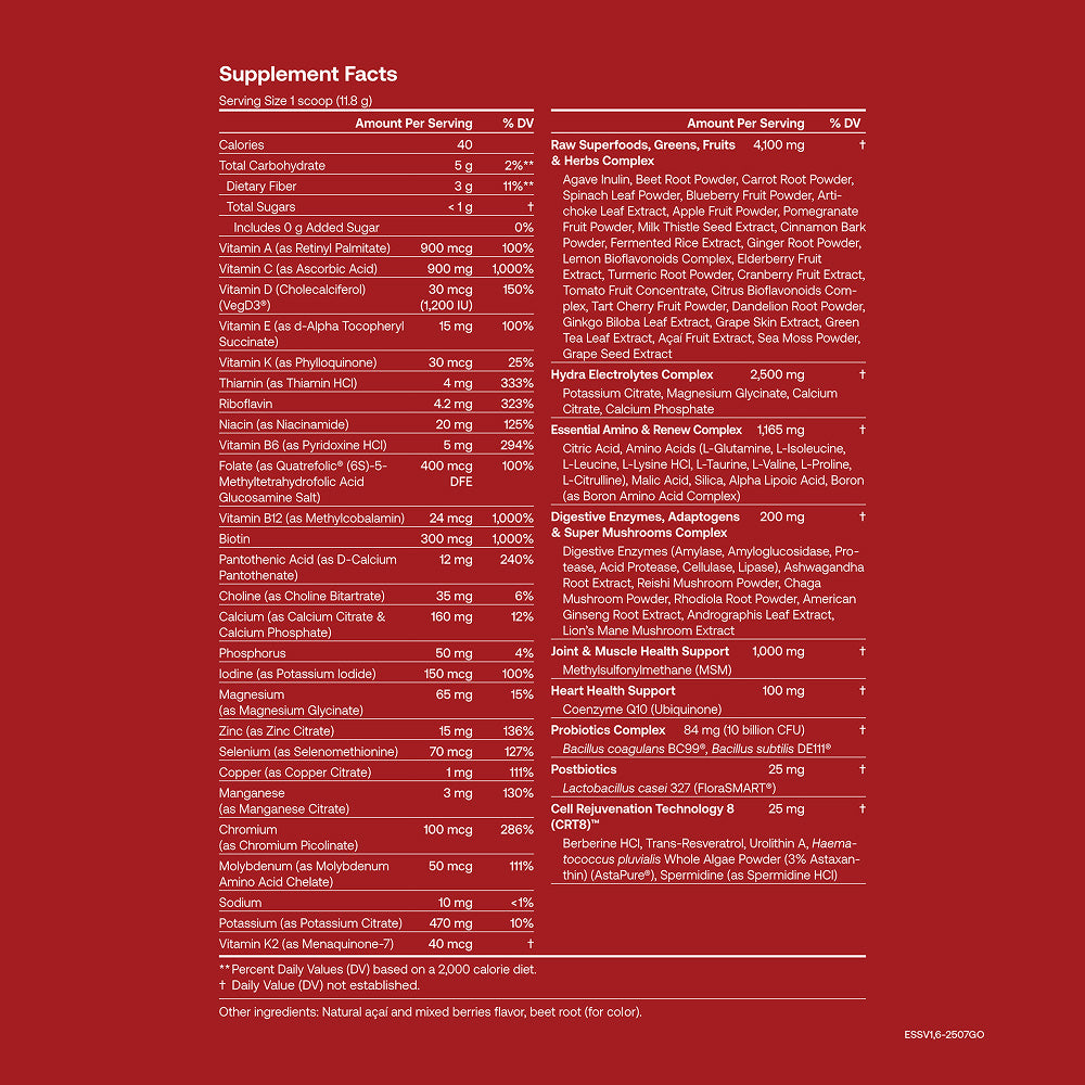 Daily Ultimate Essentials + Hydration: Experience a delightful blend with earthy undertones, a subtle tartness, and a hint of chocolate, culminating in a smooth acai and mixed berries finish.