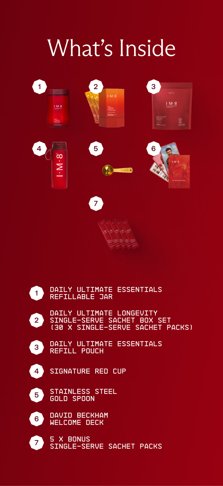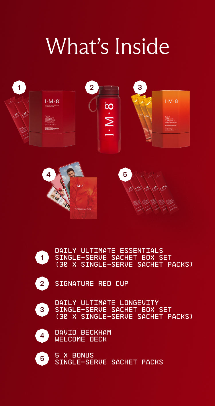 The Beckham Stack combines IM8 Daily Ultimate Essentials and Daily Ultimate Longevity for full-spectrum nutrition and healthy aging—for today and tomorrow.*